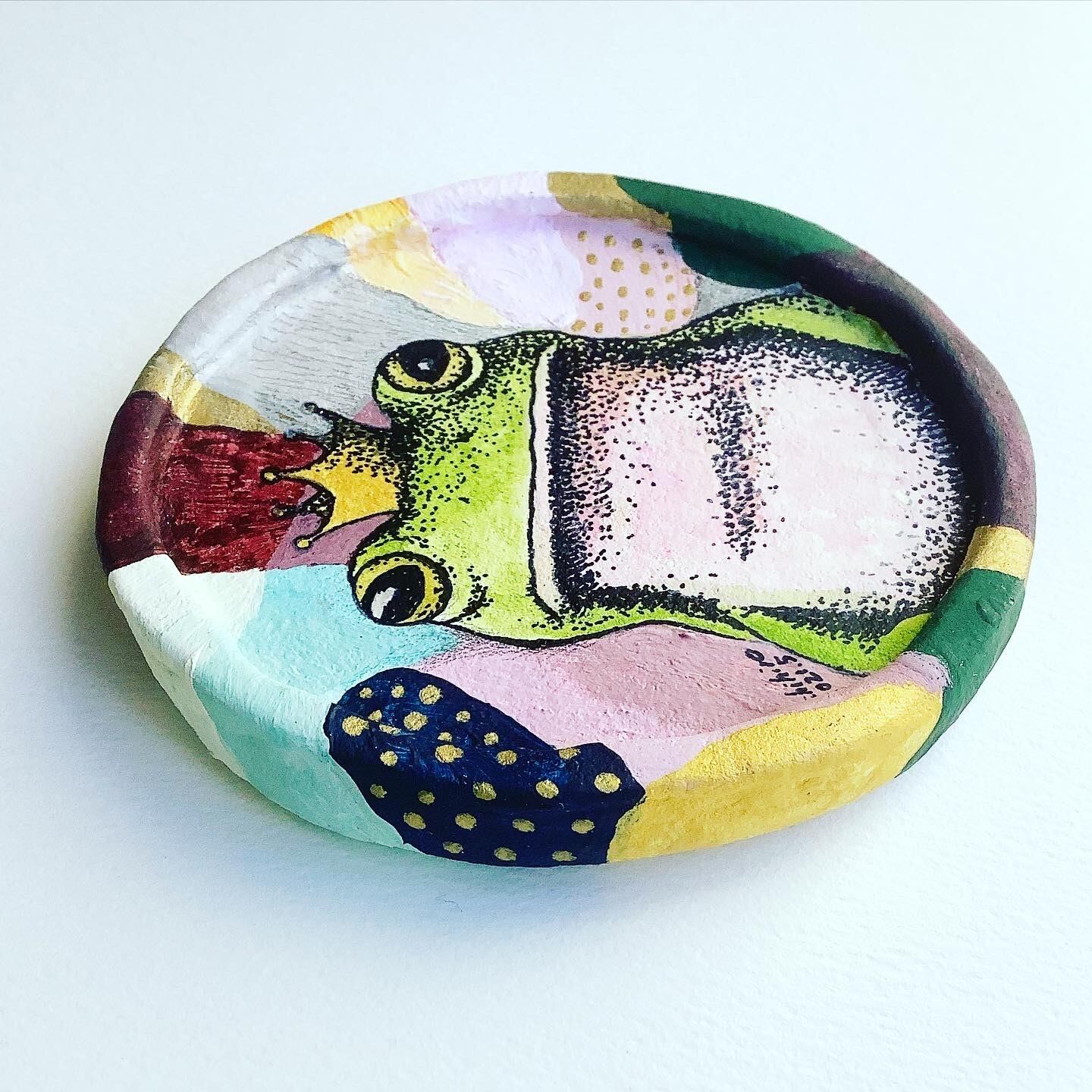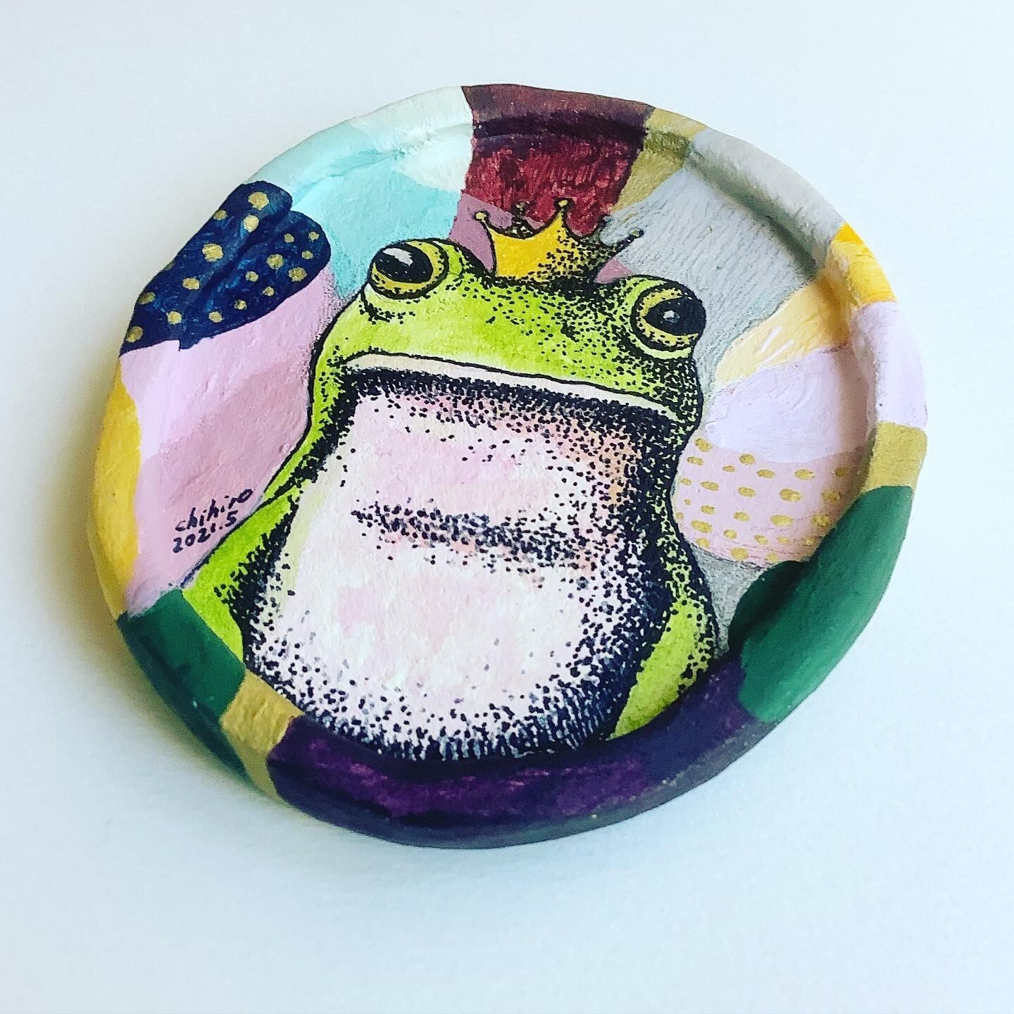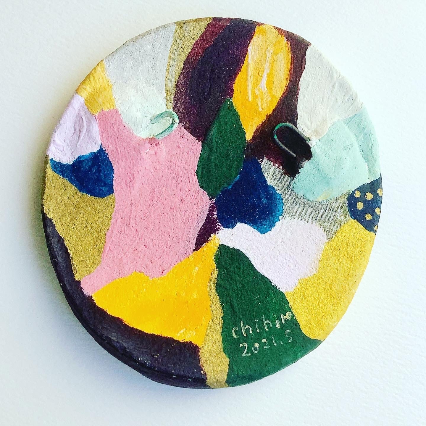 石粉粘土で手作りした土台にアクリル絵の具で絵を描いています。