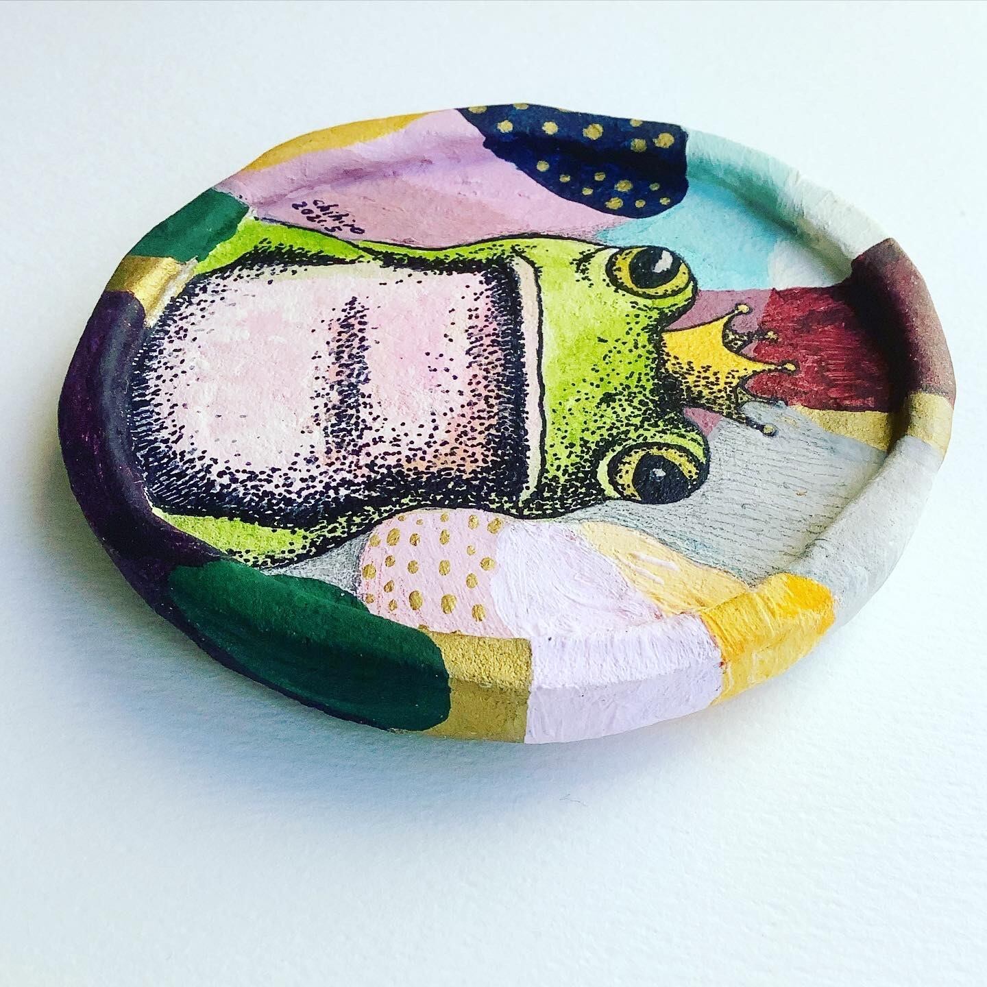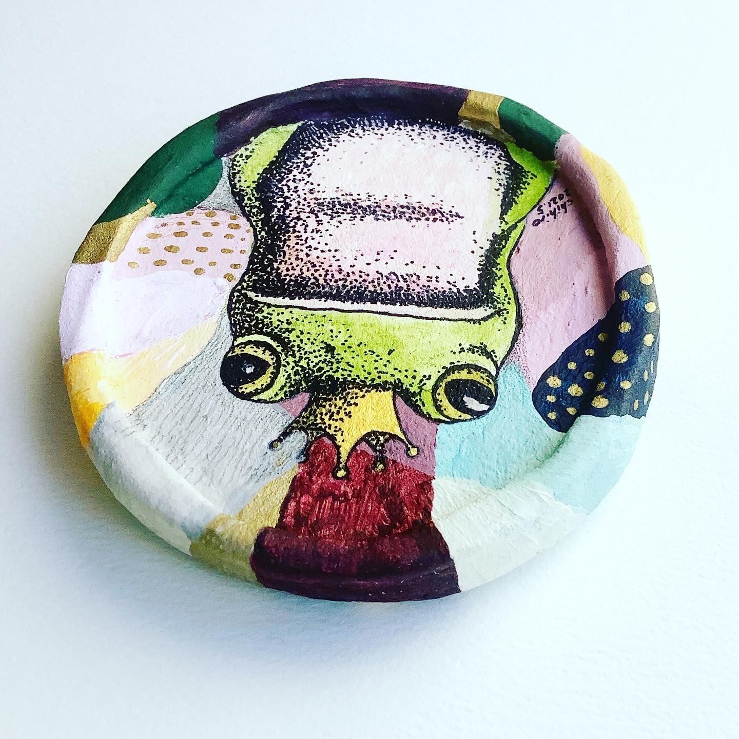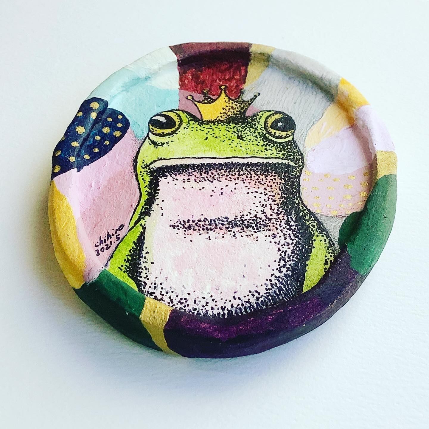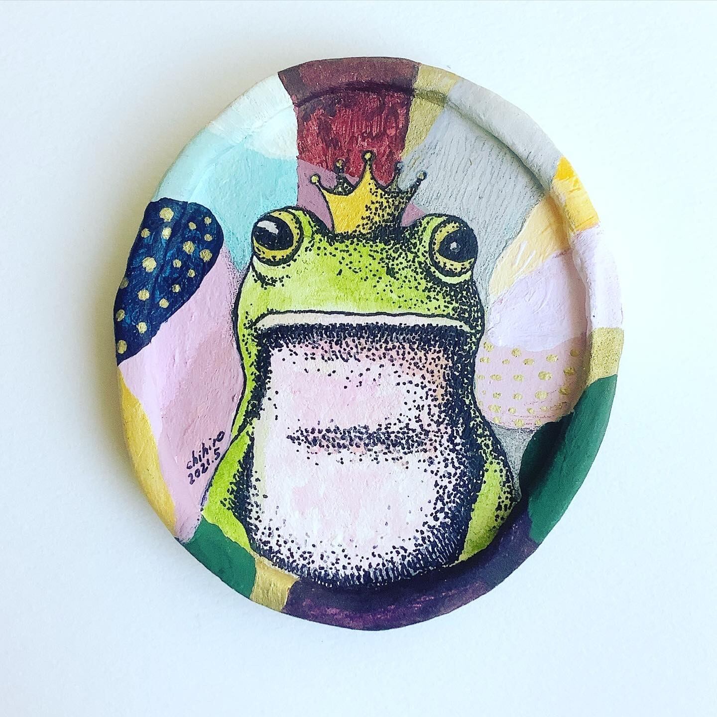石粉粘土で手作りした土台にアクリル絵の具で絵を描いています。